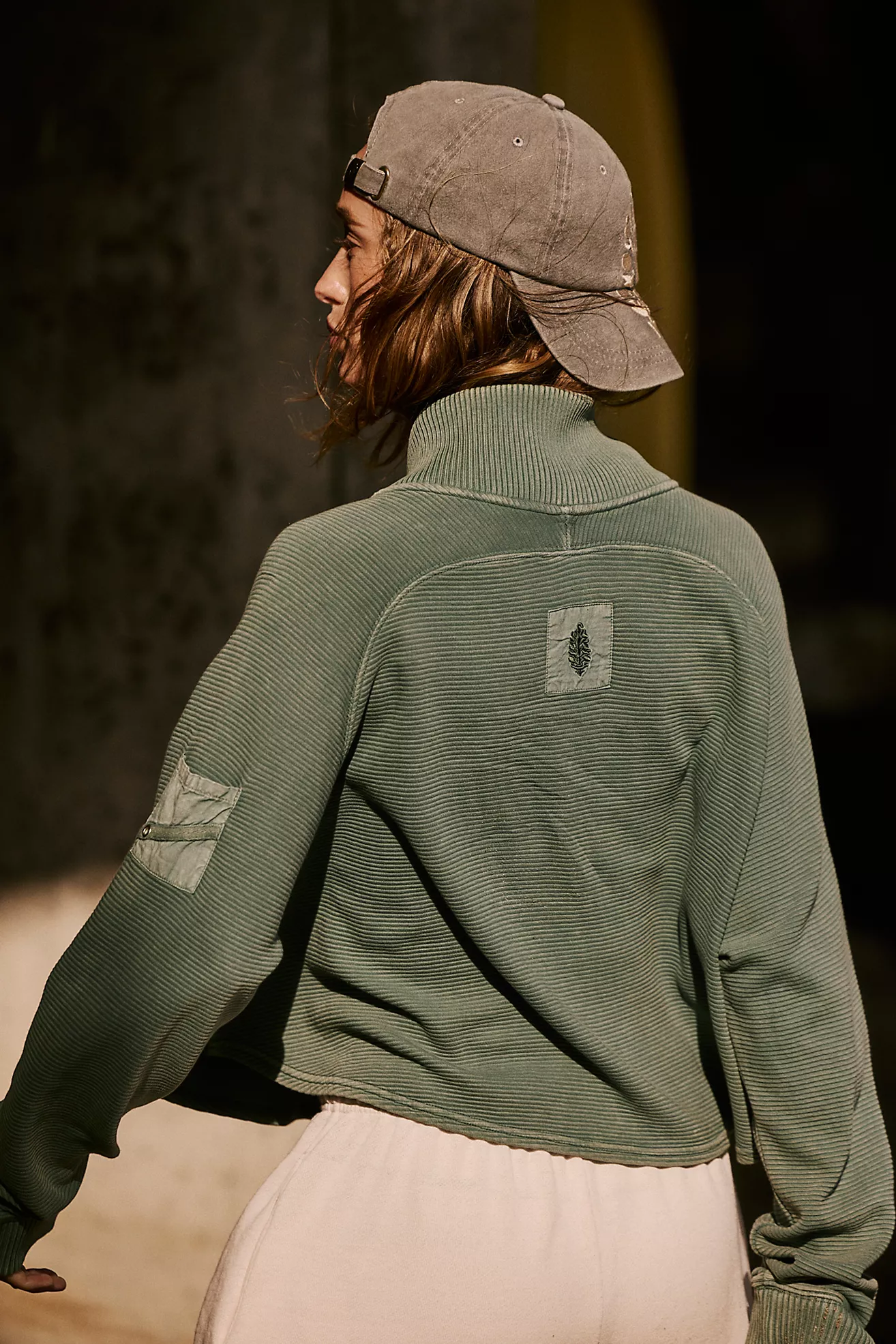 Features: Soft fabrication; relaxed silhouette; ribbed fabric and ribbed detailing at cuffs; snap closures at neck