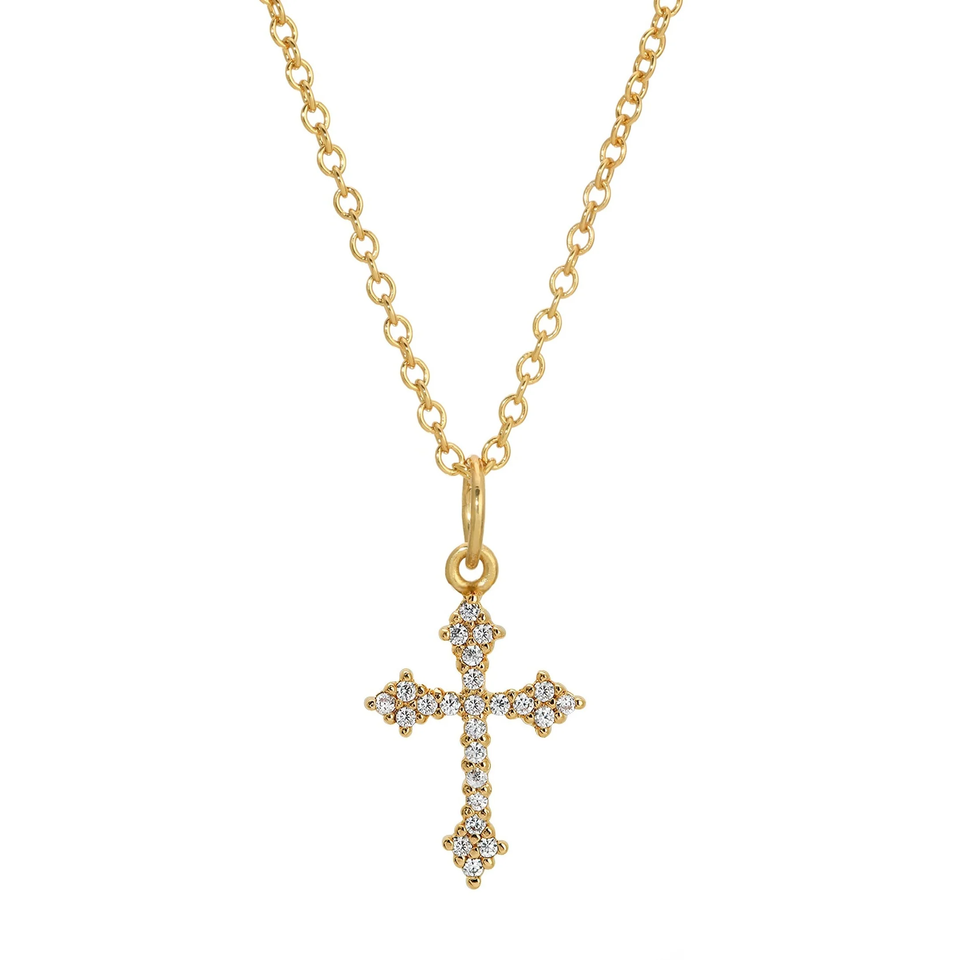 Lourdes, our gothic cross (13 mm) is crafted from 18K gold plated eco-brass and pave set white cz's. Elevate your accessory collection with this 16"-18" necklace.